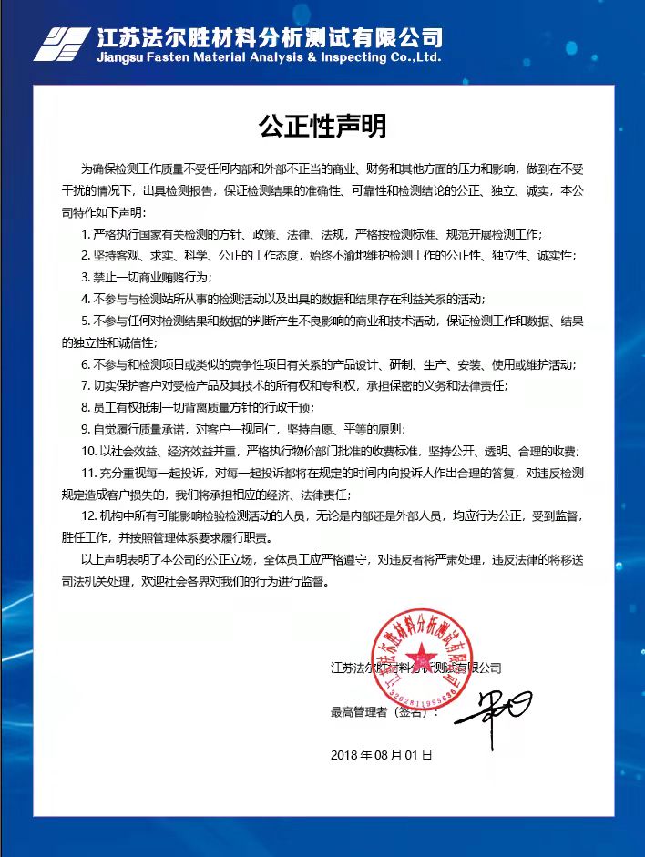 2018年江苏法尔胜材料分析测试有限公司公正性声明